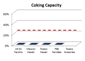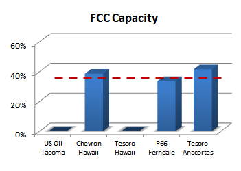 Tesoro Hawaii has a hydrogen plant, so that helps to offset H2 requirements. However, octane balances are strained with such limited reforming capacity. US Oil is such a small facility that it’s not worth discussing much. Interestingly enough, the PADD 5 Dud refineries mostly have adequate gasoil cracking capabilities when compared to the region peers. Three of the refineries meet or exceed the PADD average. Tesoro Hawaii does