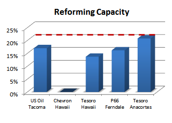 Reformer capacity provides indication in two areas: how well can a refinery maintain octane balance and how well can a refinery maintain hydrogen balance. Since PADD 5 lacks the concentration of 3rd party Hydrogen producers that PADD 3 enjoys, most PADD 5 refineries have to