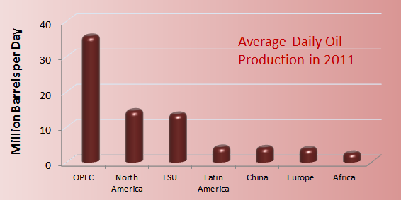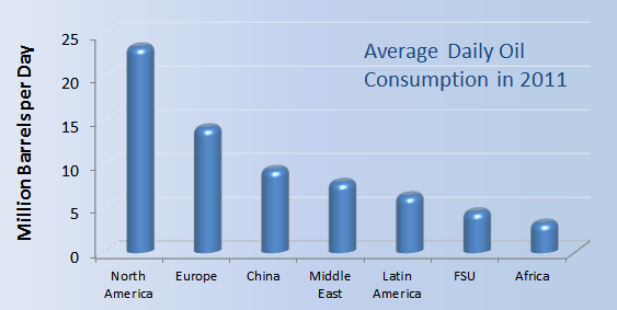 Currently the demand for oil around the world is roughly 90 million barrels per day. Daily global oil consumption broken down by regions is shown below.