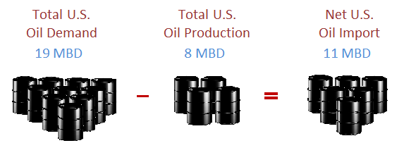 To place U.S. oil dependency into context, we revisit oil supply and demand fundamentals. Simply put, the United States consumes WAY more oil than it produces. As shown above, the U.S. consumes roughly 19 MBPD of oil. Since it only produces 8 MBPD, this results in a net import of 11 million barrels per day of foreign oil.