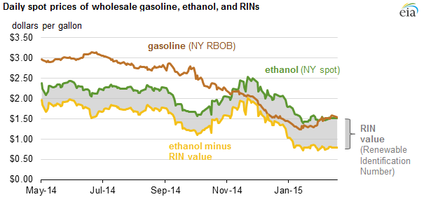 As ethanol prices rose to a $0.25/gal-to-$0.30/gal premium over gasoline in December and January, prices for the 2014 D6 ethanol RIN, which can be used for RFS compliance in either 2014 or 2015, increased by roughly the same amount.