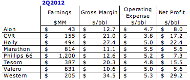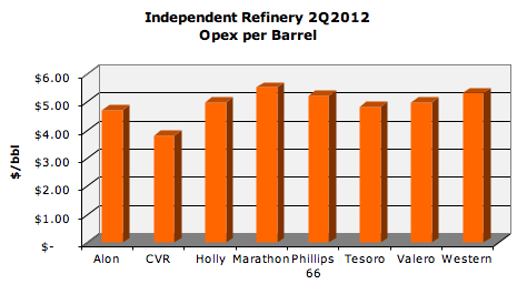 All three refiners form the “best in class” group of independent refiners in terms of net profit per barrel for the second quarter 2012. These PADD II refiners all capitalized on inexpensive crude that priced at a discount to WTI. While inexpensive crude maybe the source of gross margin per barrel, each of these refiners also lead the pack in controlling operating expense. Especially Holly and CVR, which held operating expense at or below $5/bbl.
