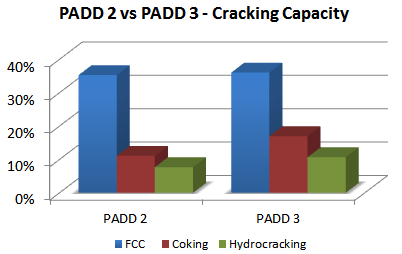 By comparing capacities of cracking units, you can see that PADD 2 refineries do
