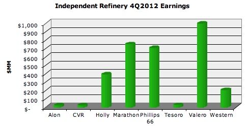 U.S. independent refinery earnings in the fourth quarter of 2012 were over $3 billion dollars. Despite several turnarounds and lower product cracking margins the refiners continued to take advantage of discounted inland crude.