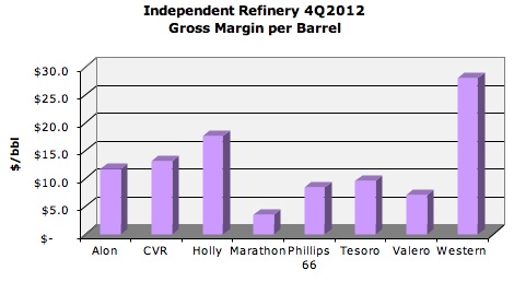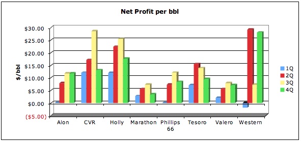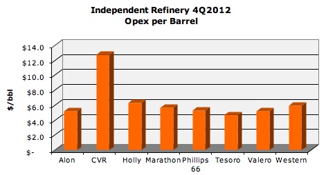 While Phillips 66 was on the lower end of the group in operating expense per barrel, their overall earnings stepped down in the quarter. But their further expansion into inland crude sourcing at Bayway and in the Gulf Coast could help improve their per barrel net profit. They announced they plan to receive over 400 rail cars in the 1Q2013.